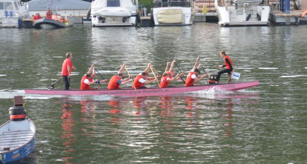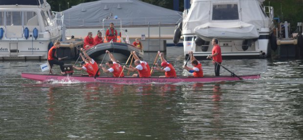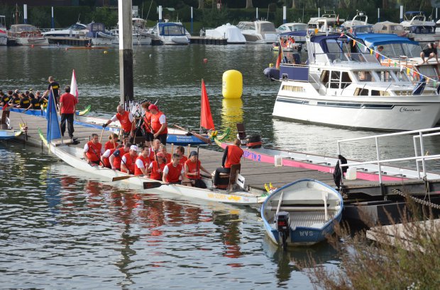 Die Besetzung dieser Regatta ist hochkarätig, schließlich befindet man sich inmitten einer der großen Drachenboot-Hochburgen Deutschlands. In der “Fun”-Klasse fahren hier keine Firmenmannschaften, die vorher nur 2 oder 3 mal im Boot gesessen haben, sondern gestandene Drachenboot-Teams mit erfahrenen Paddlern – in der Sportklasse starten die Teams mit einem hohen Anteil an Leistungspaddlern, die auch in diversen Nationalteams dabei sind. Die sogenannte “Fun”-Klasse war deshalb sicherlich die richtige Wahl für uns.
