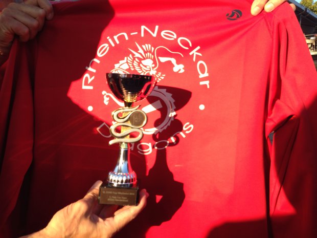 Die abschließende Siegerehrung brachte Überraschungen mit sich: So zeigte sich, dass wir im 1000-m-Rennen nicht nur in unserer Klasse gewonnen hatten, sondern sogar in der Gesamtwertung mit den Booten der Sportklasse die 2.-beste Zeit erkämpfen konnten. Als Belohnung gab es einen wunderschönen Pokal – einen aus Holz geschnitzten Drachen, der nun unser Bootshaus ziert. Und auch für den 3. Platz in der 2000-m-Distanz gab es einen sehenswerten Pokal: